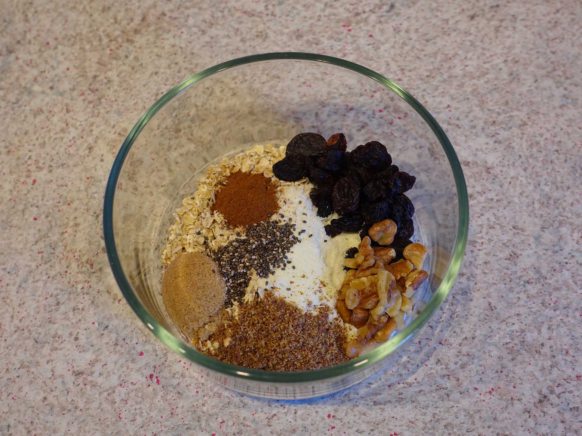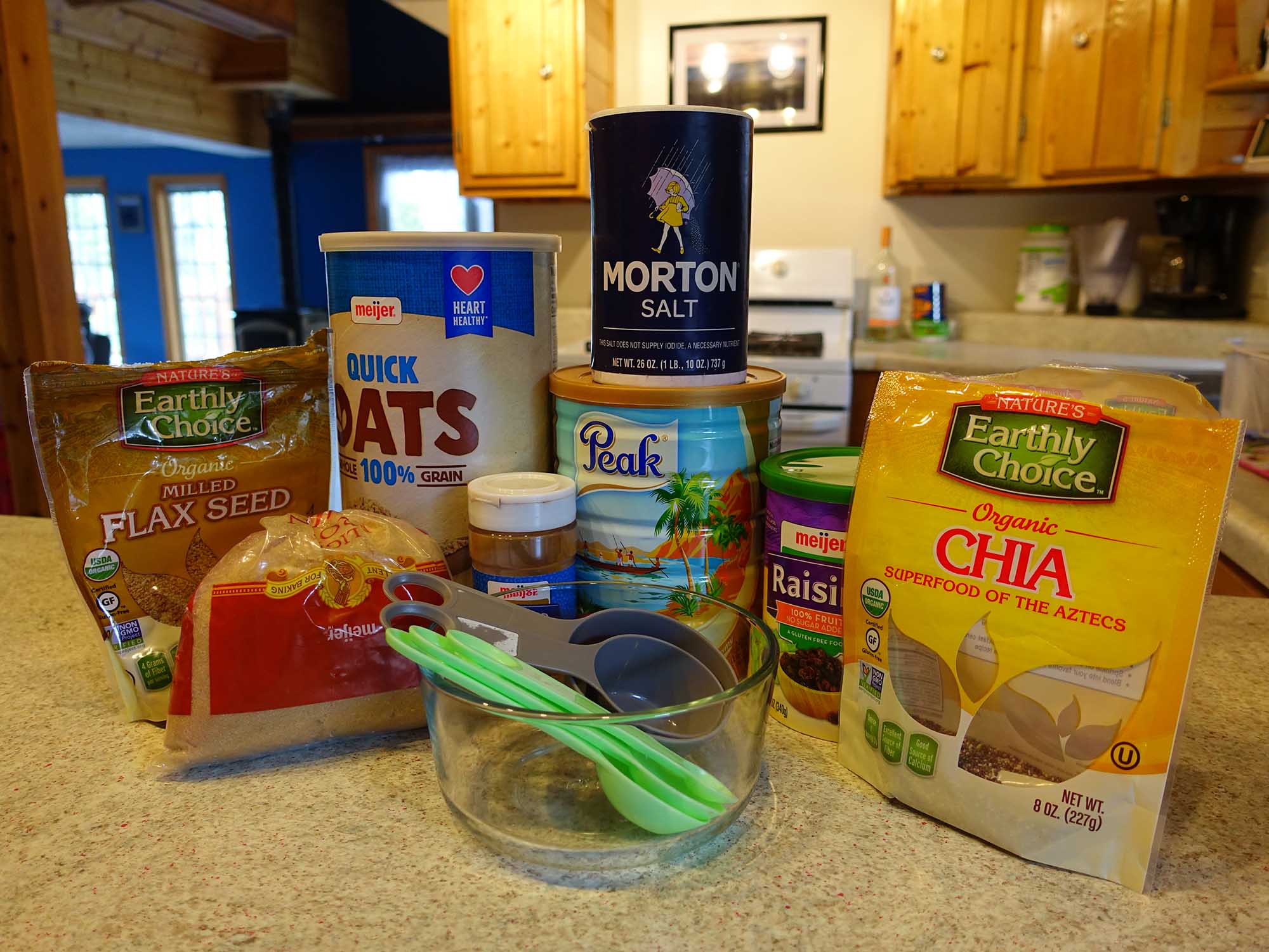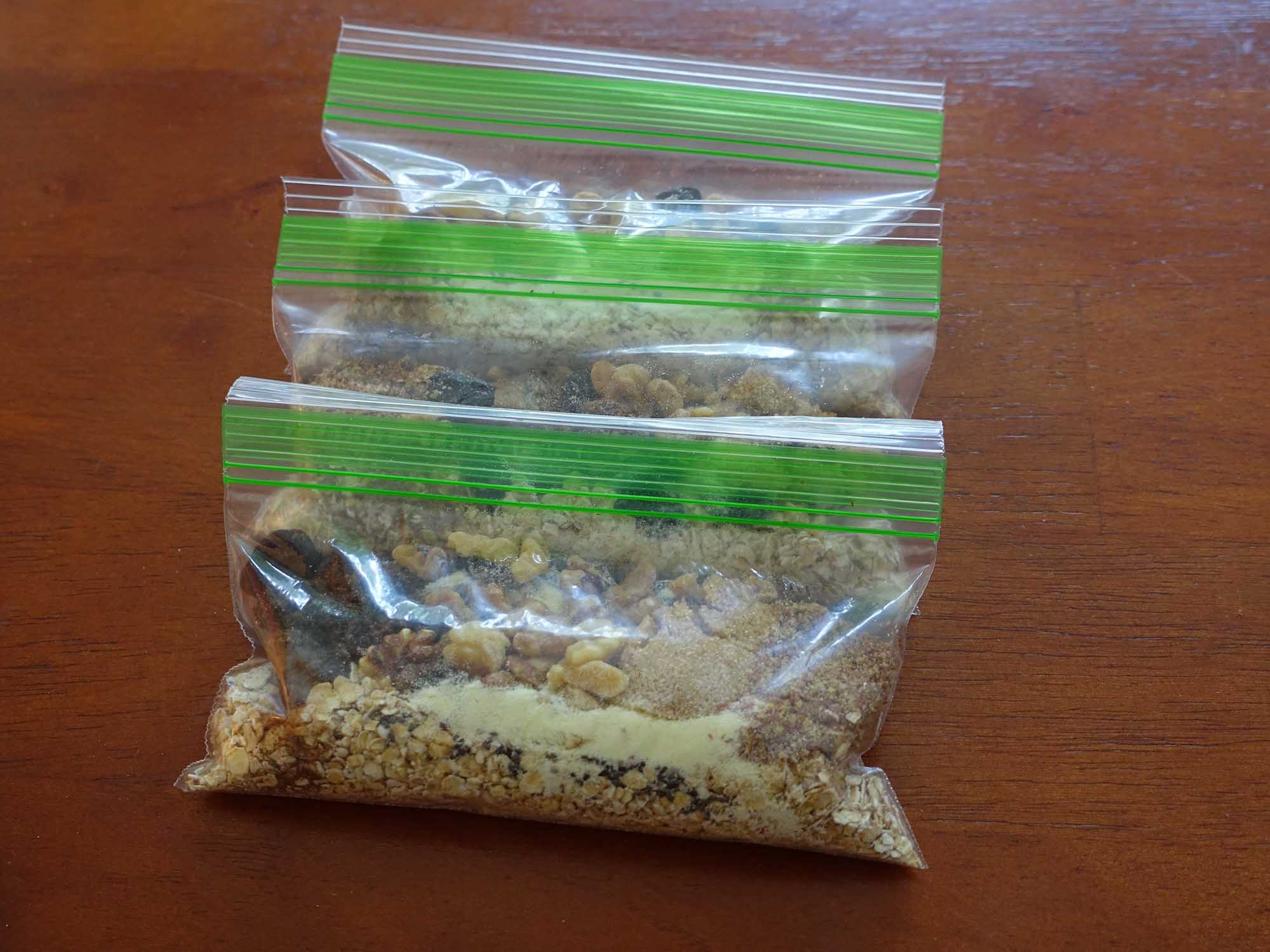 Combine the following (When testing it out at home, feel free to put into a bowl. If bringing on the trail, we use “snack size” ziplock bags):