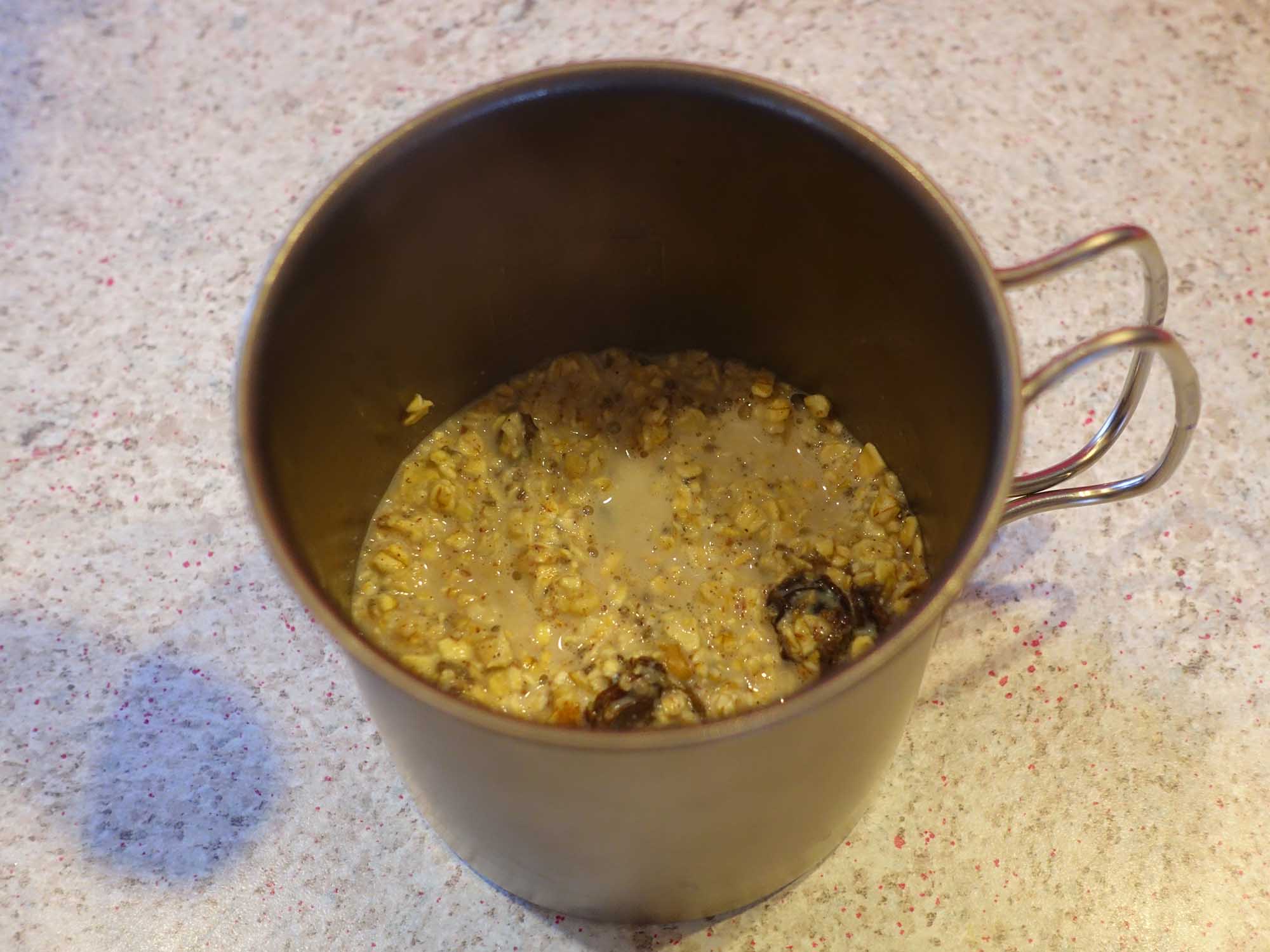 When you’re ready to feast, add hot water (from a tea kettle at home, or stove system on the trail) until all ingredients are just submerged (if you don’t like your oatmeal thick, you may want to add more water). Stir, cover, let sit for a couple minutes and then enjoy!