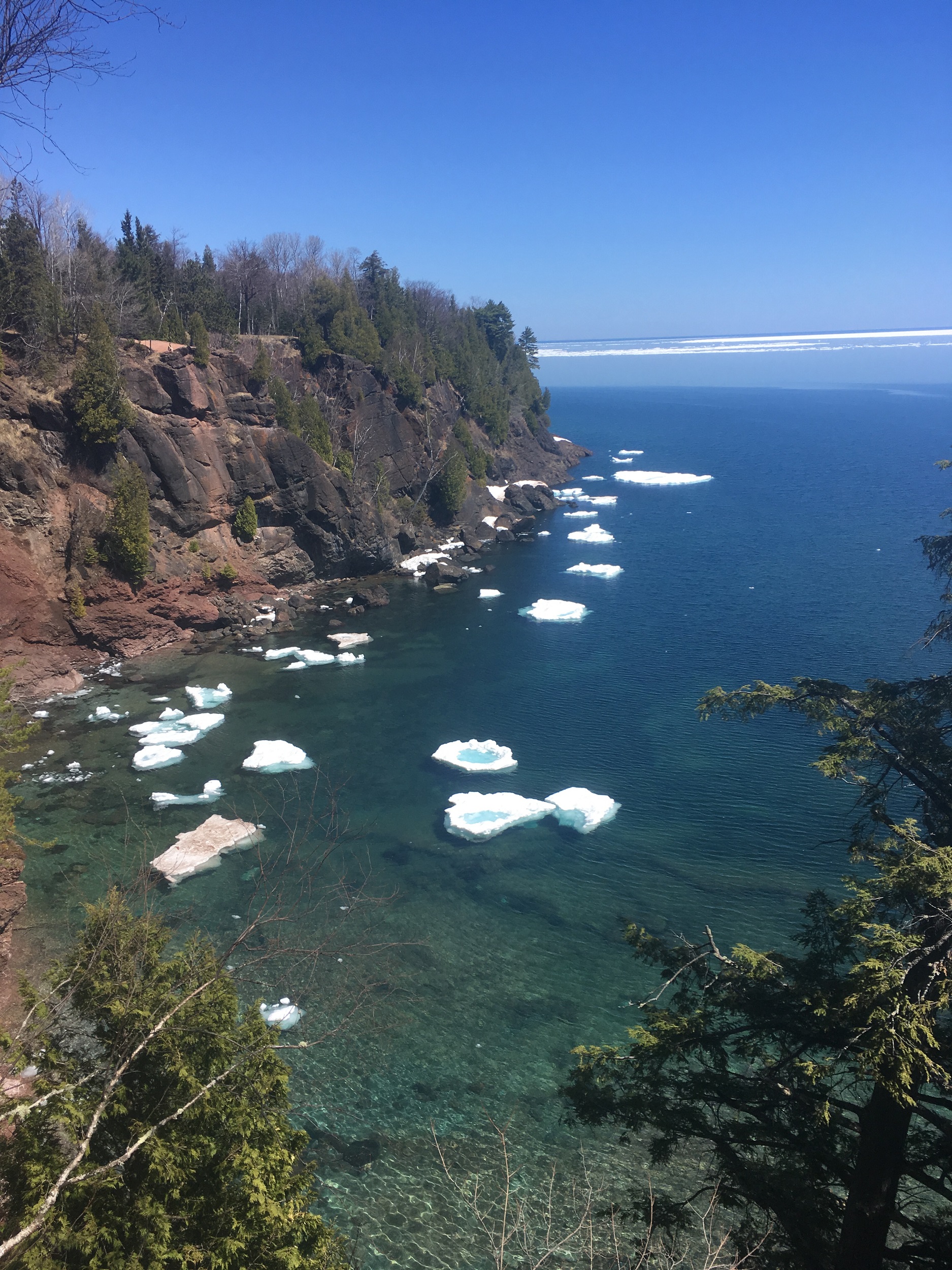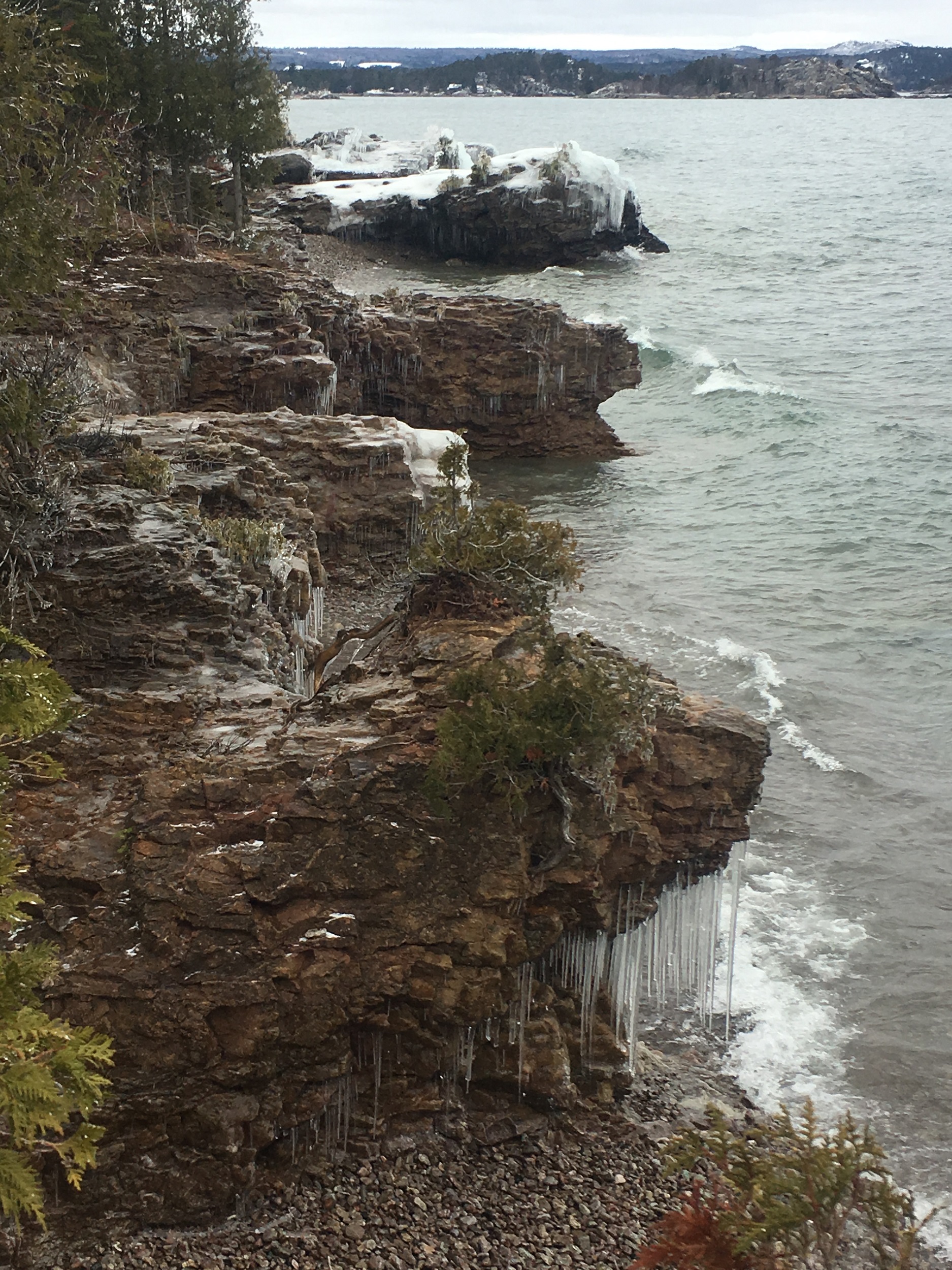 The trails that circumnavigate Presque Isle are relatively flat and easy to walk. There is a minor hill at the beginning which is 90 ft over 0.2 miles. In the summer cars are allowed on Peter White Road which circumnavigates the park. You can drive to the small parking area mentioned at location (3) in the directions below which has closer access to Blackrocks.